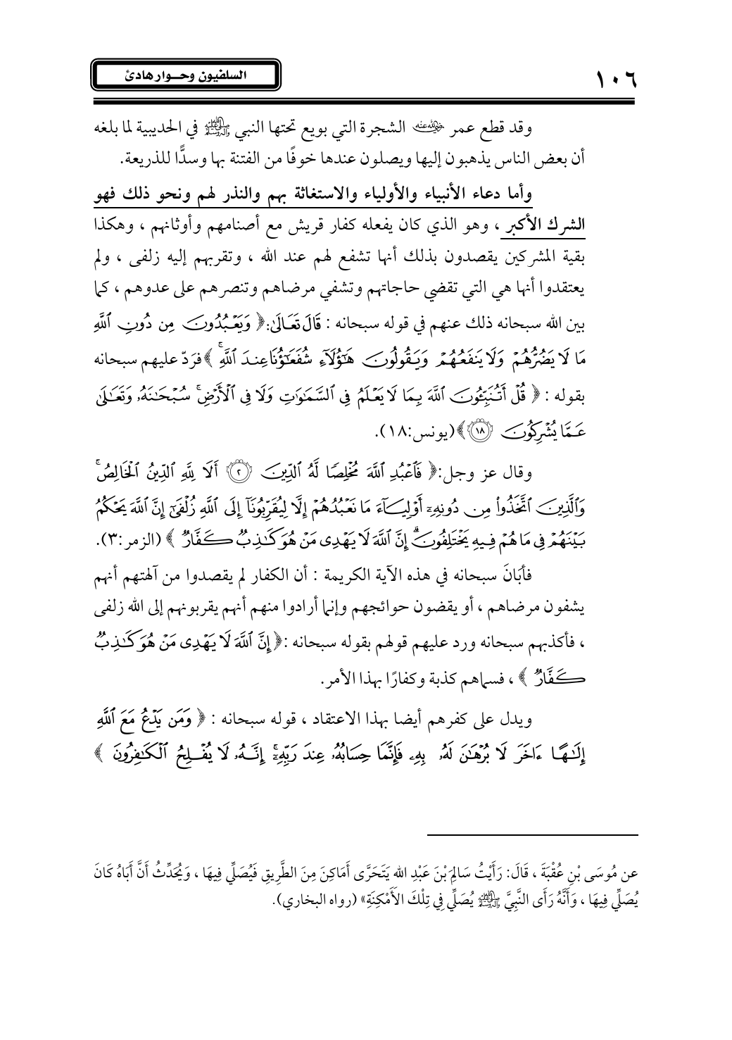 وأما دعاء الأنبياء والأولياء والاستغاثة بهم والنذر لهم ونحو ذلك فهو الشرك الأكبر , وهو الذي كان يفعله كفار قريش مع أصنامهم وأوثانهم , وهكذا بقية المشركين يقصدون بذلك أنها تشفع لهم عند الله , وتقربهم إليه زلفى , ولم يعتقدوا أنها هي التي تقضي حاجاتهم وتشفي مرضاهم وتنصرهم على عدوهم , كما بين الله سبحانه ذلك عنهم في قوله سبحانه: قال تعالى: {وَيَعْبُدُونَ مِنْ دُونِ اللَّهِ مَا لَا يَضُرُّهُمْ وَلَا يَنْفَعُهُمْ وَيَقُولُونَ هَؤُلَاءِ شُفَعَاؤُنَا عِنْدَ اللَّهِ} فرَدّ عليهم سبحانه بقوله: {قُلْ أَتُنَبِّئُونَ اللَّهَ بِمَا لَا يَعْلَمُ فِي السَّمَاوَاتِ وَلَا فِي الْأَرْضِ سُبْحَانَهُ وَتَعَالَى عَمَّا يُشْرِكُونَ (18)} (يونس:18).