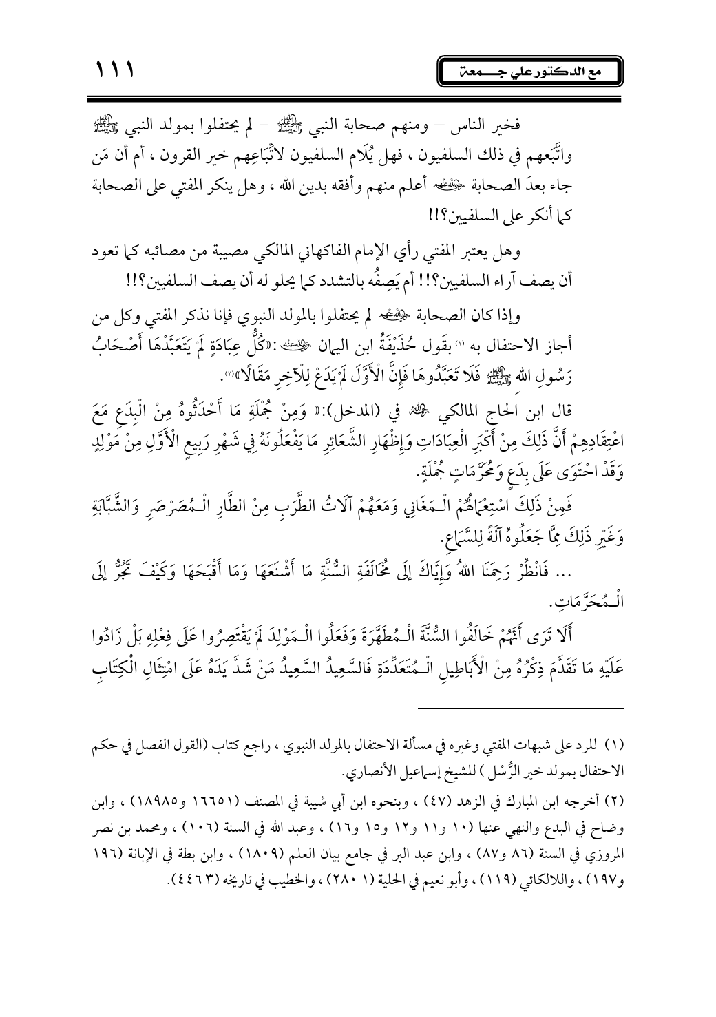 (¬1) للرد على شبهات المفتي وغيره في مسألة الاحتفال بالمولد النبوي، راجع كتاب (القول الفصل في حكم الاحتفال بمولد خير الرُّسْل) للشيخ إسماعيل الأنصاري.
