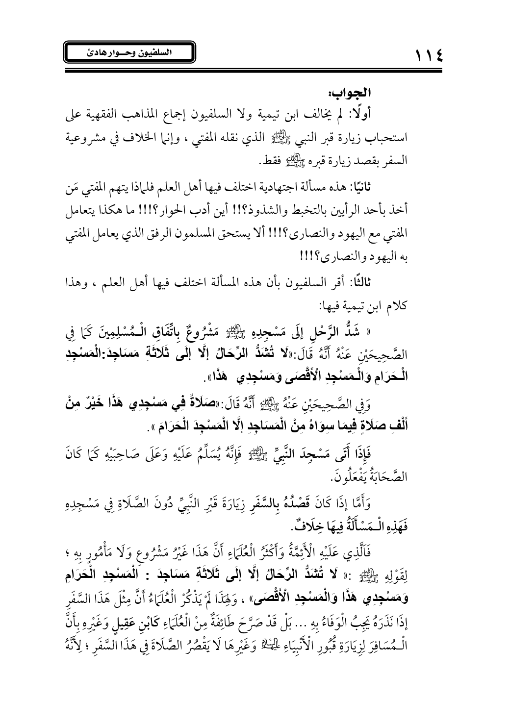 أولًا: لم يخالف ابن تيمية ولا السلفيون إجماع المذاهب الفقهية على استحباب زيارة قبر النبي - صلى الله عليه وآله وسلم - الذي نقله المفتي، وإنما الخلاف في مشروعية السفر بقصد زيارة قبره - صلى الله عليه وآله وسلم - فقط.