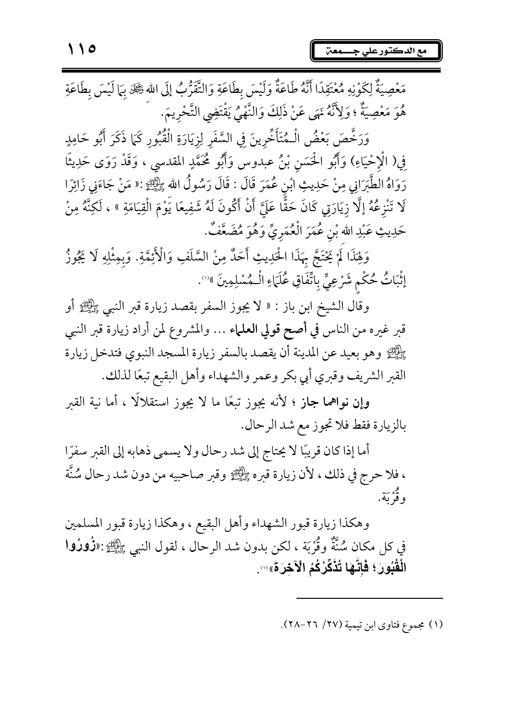 وقال الشيخ ابن باز: «لا يجوز السفر بقصد زيارة قبر النبي - صلى الله عليه وآله وسلم - أو قبر غيره من الناس في أصح قولي العلماء ... والمشروع لمن أراد زيارة قبر النبي - صلى الله عليه وآله وسلم - وهو بعيد عن المدينة أن يقصد بالسفر زيارة المسجد النبوي فتدخل زيارة القبر الشريف وقبري أبي بكر وعمر والشهداء وأهل البقيع تبعًا لذلك.