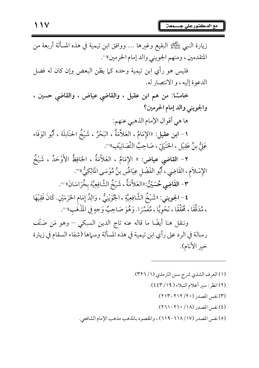 زيارة النبي - صلى الله عليه وآله وسلم - البقيع وغيرها ... ووافق ابن تيمية في هذه المسألة أربعة من المتقدمين، ومنهم الجويني والد إمام الحرمين» (¬1).