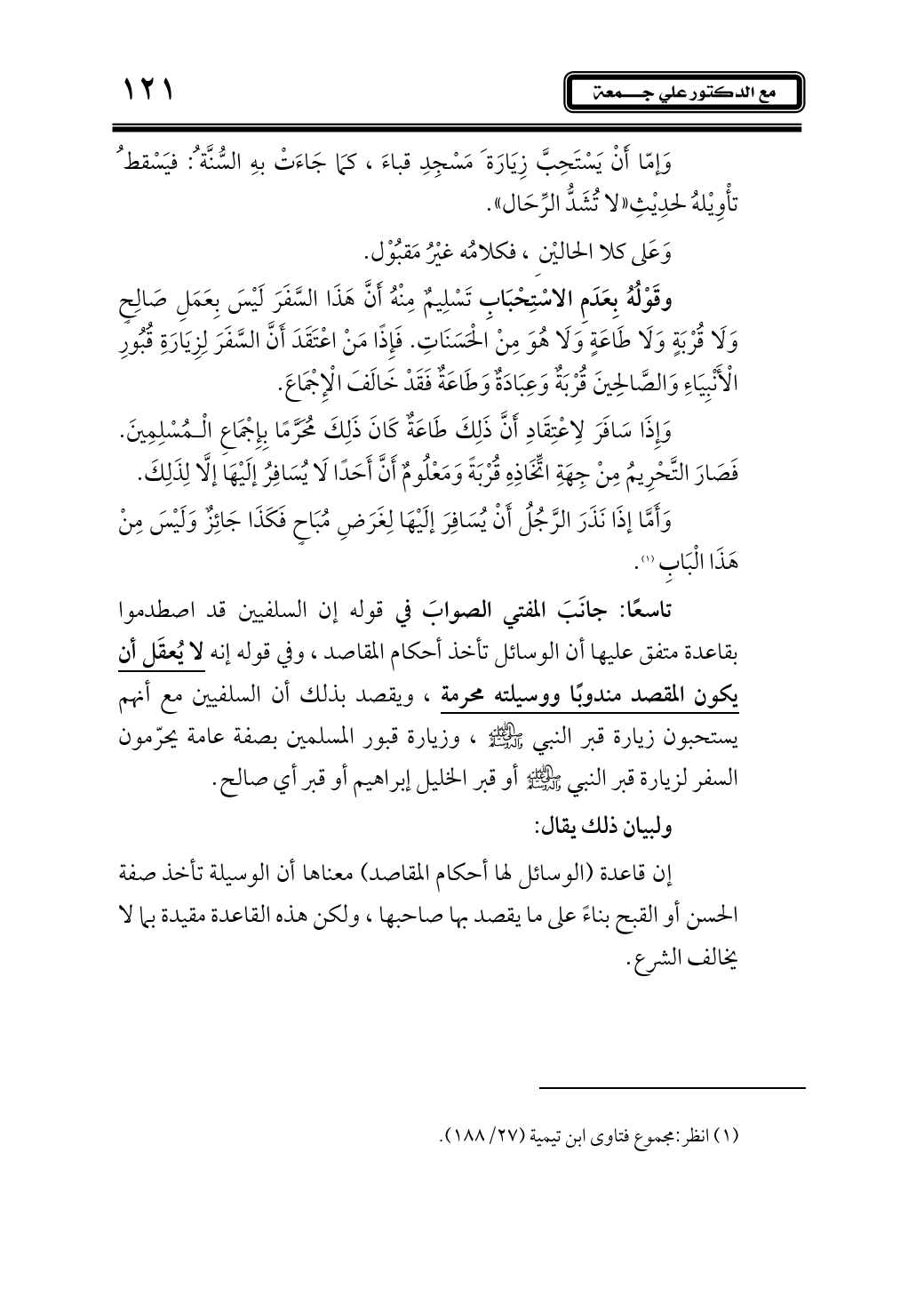 تاسعًا: جانَبَ المفتي الصوابَ في قوله إن السلفيين قد اصطدموا بقاعدة متفق عليها أن الوسائل تأخذ أحكام المقاصد، وفي قوله إنه لا يُعقَل أن يكون المقصد مندوبًا ووسيلته محرمة، ويقصد بذلك أن السلفيين مع أنهم يستحبون زيارة قبر النبي - صلى الله عليه وآله وسلم -، وزيارة قبور المسلمين بصفة عامة يحرّمون السفر لزيارة قبر النبي - صلى الله عليه وآله وسلم - أو قبر الخليل إبراهيم أو قبر أي صالح.