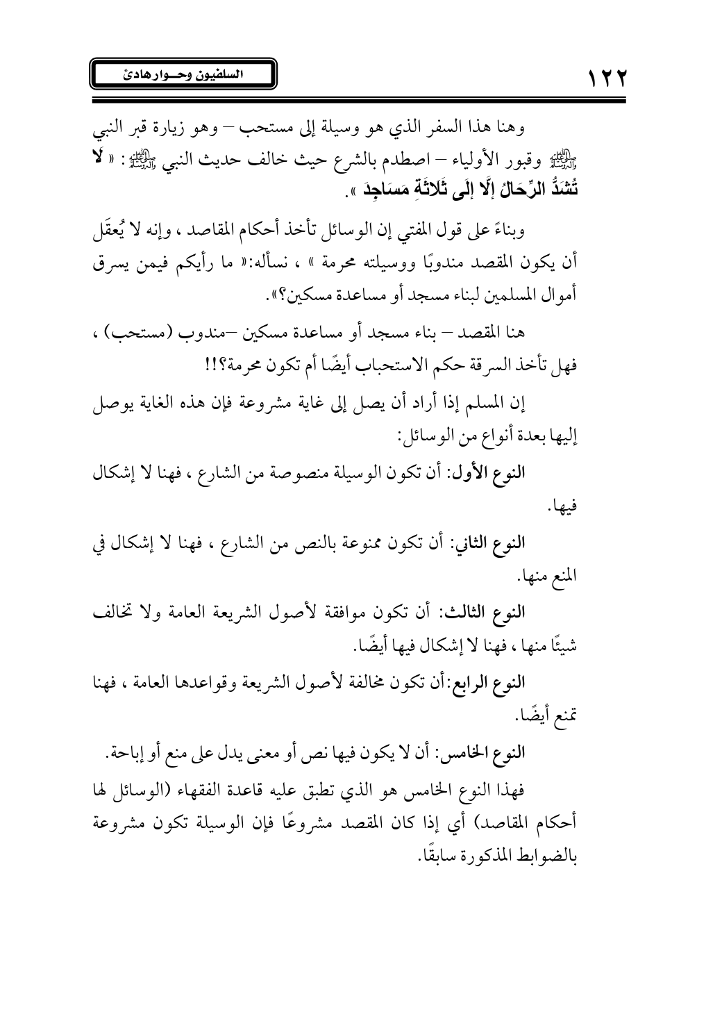 وهنا هذا السفر الذي هو وسيلة إلى مستحب - وهو زيارة قبر النبي - صلى الله عليه وآله وسلم - وقبور الأولياء - اصطدم بالشرع حيث خالف حديث النبي - صلى الله عليه وآله وسلم -: «لَا تُشَدُّ الرِّحَالُ إلَّا إلَى ثَلَاثَةِ مَسَاجِدَ».