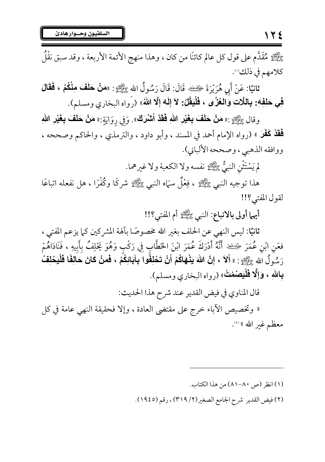 ثانيًا: ليس النهي عن الحلف بغير الله مخصوصًا بآلهة المشركين كما يزعم المفتي، فعَنِ ابْنِ عُمَرَ - رضي الله عنهما - أَنَّهُ أَدْرَكَ عُمَرَ ابْنَ الخَطَّابِ فِي رَكْبٍ وَهُوَ يَحْلِفُ بِأَبِيهِ، فَنَادَاهُمْ رَسُولُ اللهِ - صلى الله عليه وآله وسلم -: «أَلاَ، إِنَّ اللهَ يَنْهَاكُمْ أَنْ تَحْلِفُوا بِآبَائِكُمْ، فَمَنْ كَانَ حَالِفًا فَلْيَحْلِفْ بِاللهِ، وَإِلَّا فَلْيَصْمُتْ» (رواه البخاري ومسلم).