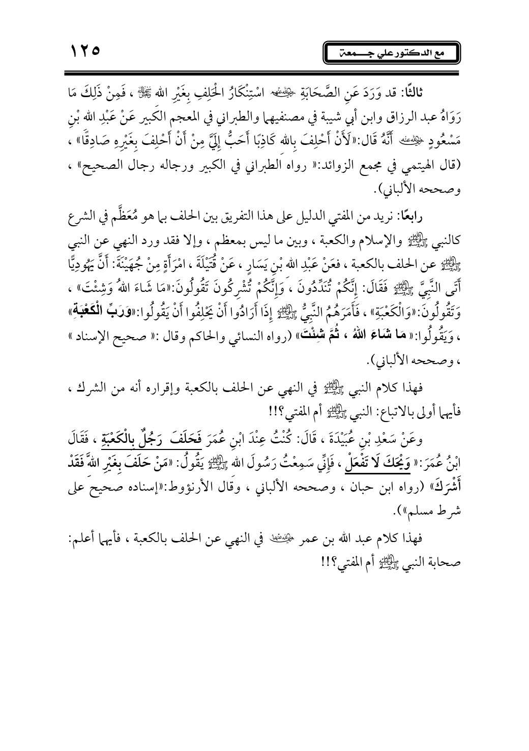 فهذا كلام عبد الله بن عمر - رضي الله عنهما - في النهي عن الحلف بالكعبة، فأيهما أعلم: صحابة النبي - صلى الله عليه وآله وسلم - أم المفتي؟!!
