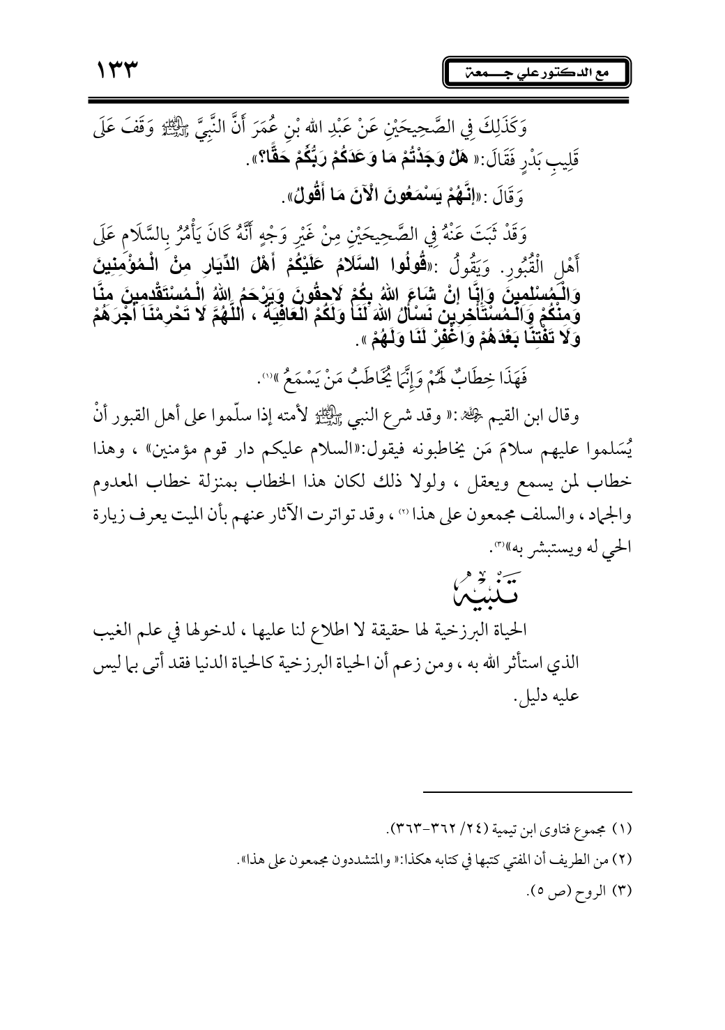 وَكَذَلِكَ فِي الصَّحِيحَيْنِ عَنْ عَبْدِ اللهِ بْنِ عُمَرَ أَنَّ النَّبِيَّ - صلى الله عليه وآله وسلم - وَقَفَ عَلَى قَلِيبِ بَدْرٍ فَقَالَ: «هَلْ وَجَدْتُمْ مَا وَعَدَكُمْ رَبُّكُمْ حَقًّا؟».