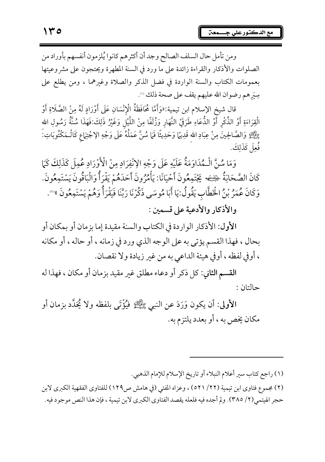 وَمَا سُنَّ الْمُدَاوَمَةُ عَلَيْهِ عَلَى وَجْهِ الِانْفِرَادِ مِنْ الْأَوْرَادِ عُمِلَ كَذَلِكَ كَمَا كَانَ الصَّحَابَةُ - رضي الله عنهم - يَجْتَمِعُونَ أَحْيَانًا: يَأْمُرُونَ أَحَدَهُمْ يَقْرَأُ وَالْبَاقُونَ يَسْتَمِعُونَ. وَكَانَ عُمَرُ بْنُ الْخَطَّابِ يَقُولُ: يَا أَبَا مُوسَى ذَكِّرْنَا رَبَّنَا فَيَقْرَأُ وَهُمْ يَسْتَمِعُونَ» (¬1).