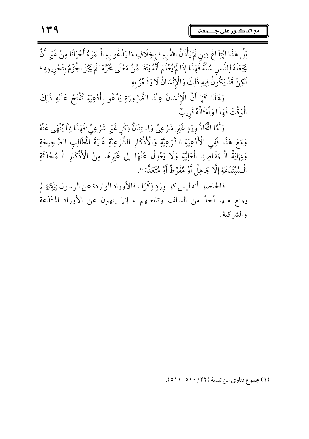 وَأَمَّا اتِّخَاذُ وِرْدٍ غَيْرِ شَرْعِيٍّ وَاسْتِنَانُ ذِكْرٍ غَيْرِ شَرْعِيٍّ: فَهَذَا مِمَّا يُنْهَى عَنْهُ وَمَعَ هَذَا فَفِي الْأَدْعِيَةِ الشَّرْعِيَّةِ وَالْأَذْكَارِ الشَّرْعِيَّةِ غَايَةُ الْمَطَالِبِ الصَّحِيحَةِ وَنِهَايَةُ الْمَقَاصِدِ الْعَلِيَّةِ وَلَا يَعْدِلُ عَنْهَا إلَى غَيْرِهَا مِنْ الْأَذْكَارِ الْمُحْدَثَةِ الْمُبْتَدَعَةِ إلَّا جَاهِلٌ أَوْ مُفَرِّطٌ أَوْ مُتَعَدٍّ» (¬1).