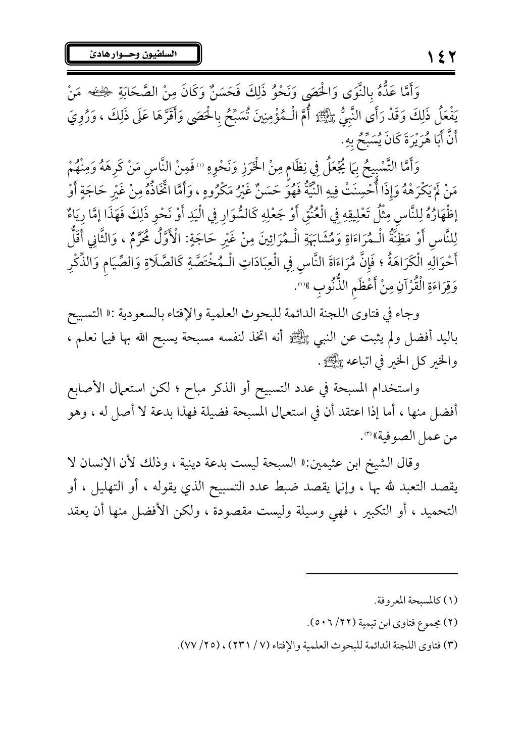 وقال الشيخ ابن عثيمين: «السبحة ليست بدعة دينية، وذلك لأن الإنسان لا يقصد التعبد لله بها، وإنما يقصد ضبط عدد التسبيح الذي يقوله، أو التهليل، أو التحميد، أو التكبير، فهي وسيلة وليست مقصودة، ولكن الأفضل منها أن يعقد