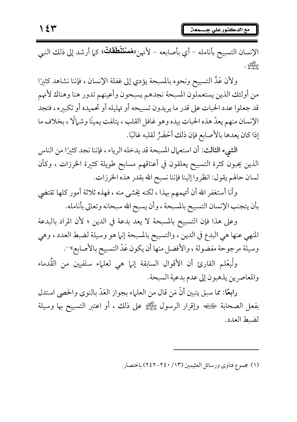وأنا أستغفر الله أن أتهمهم بهذا، لكنه يخشى منه، فهذه ثلاثة أمور كلها تقتضي بأن يتجنب الإنسان التسبيح بالمسبحة، وأن يسبح الله سبحانه وتعالى بأنامله.