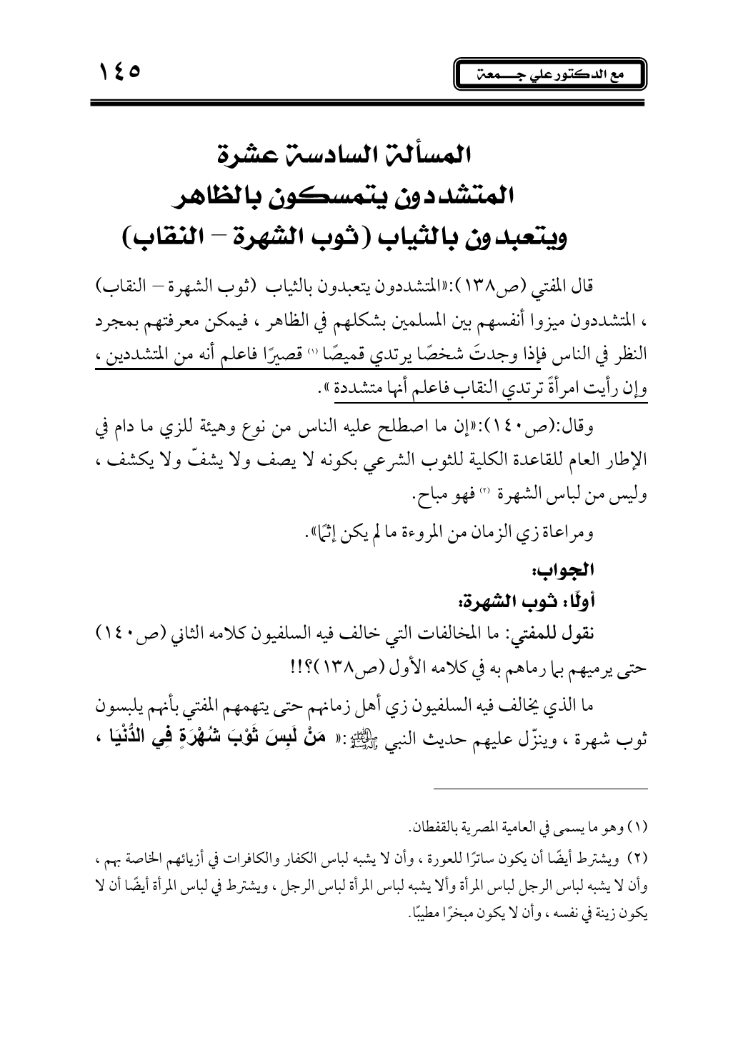 قال المفتي (ص138): «المتشددون يتعبَّدون بالثياب (ثوب الشهرة - النقاب)، المتشددون ميزوا أنفسهم بين المسلمين بشكلهم في الظاهر، فيمكن معرفتهم بمجرد النظر في الناس فإذا وجدتَ شخصًا يرتدي قميصًا (¬1) قصيرًا فاعلم أنه من المتشددين، وإن رأيت امرأةً ترتدي النقاب فاعلم أنها متشددة».