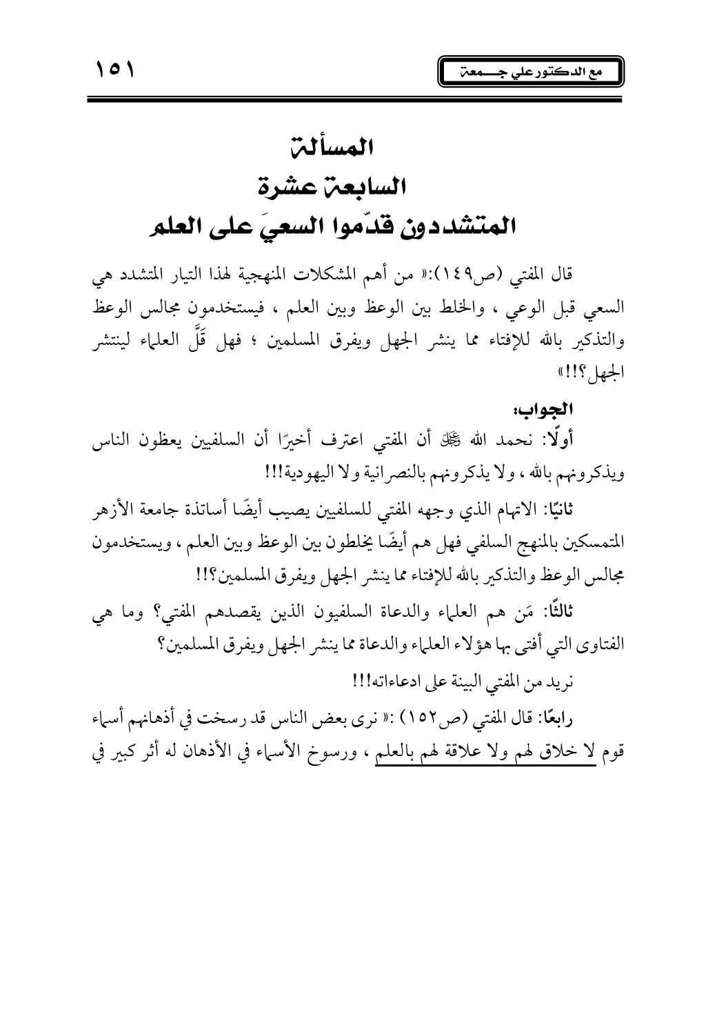 قال المفتي (ص149): «من أهم المشكلات المنهجية لهذا التيار المتشدد هي السعي قبل الوعي، والخلط بين الوعظ وبين العلم، فيستخدمون مجالس الوعظ والتذكير بالله للإفتاء مما ينشر الجهل ويفرق المسلمين؛ فهل قَلَّ العلماء لينتشر الجهل؟!!».