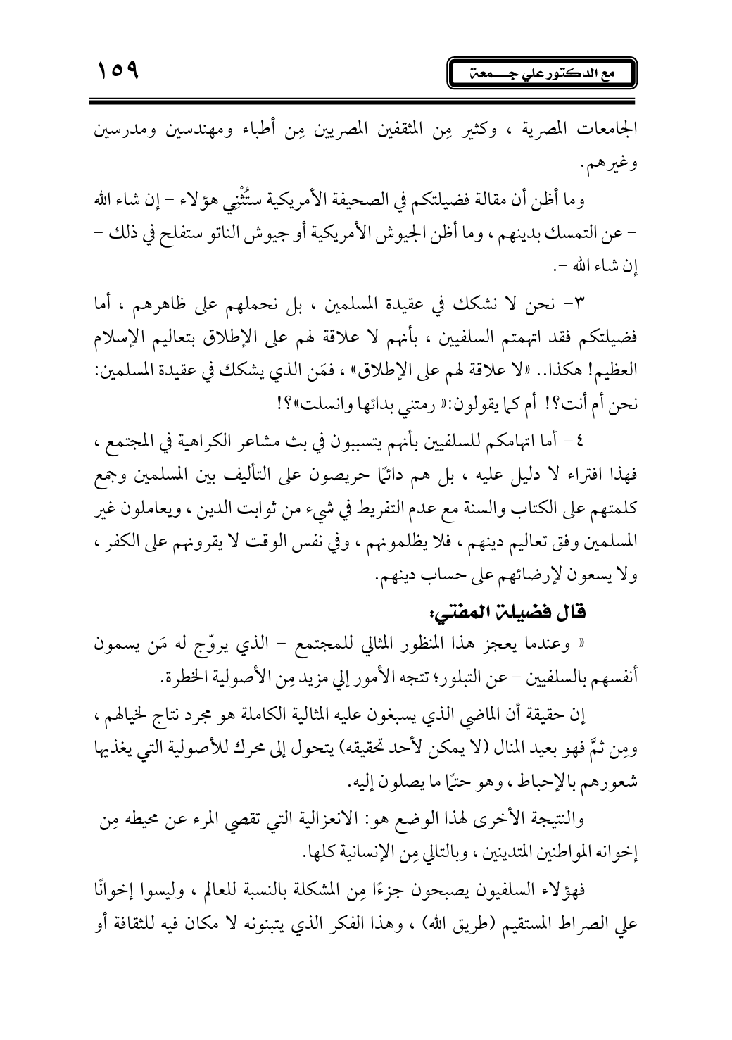 4 - أما اتهامكم للسلفيين بأنهم يتسببون في بث مشاعر الكراهية في المجتمع، فهذا افتراء لا دليل عليه، بل هم دائمًا حريصون على التأليف بين المسلمين وجمع كلمتهم على الكتاب والسنة مع عدم التفريط في شيء من ثوابت الدين، ويعاملون غير المسلمين وفق تعاليم دينهم، فلا يظلمونهم، وفي نفس الوقت لا يقرونهم على الكفر، ولا يسعون لإرضائهم على حساب دينهم.