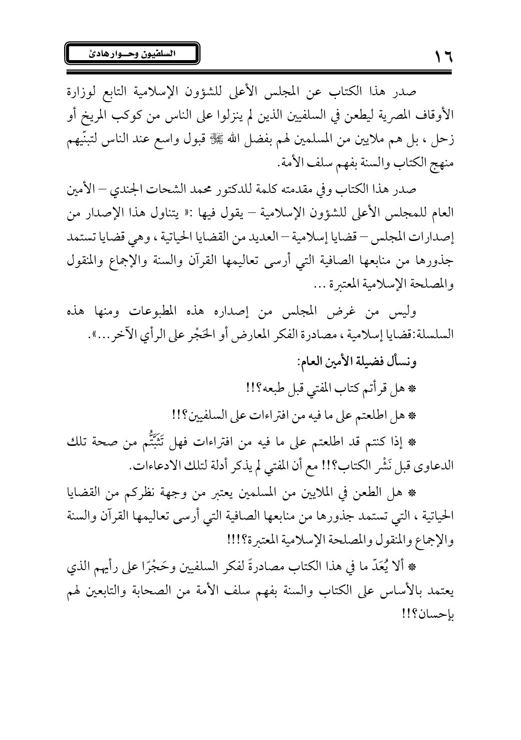 صدر هذا الكتاب عن المجلس الأعلى للشؤون الإسلامية التابع لوزارة الأوقاف المصرية ليطعن في السلفيين الذين لم ينزلوا على الناس من كوكب المريخ أو زحل، بل هم ملايين من المسلمين لهم بفضل الله - سبحانه وتعالى - قبول واسع عند الناس لتبنّيهم منهج الكتاب والسنة بفهم سلف الأمة.