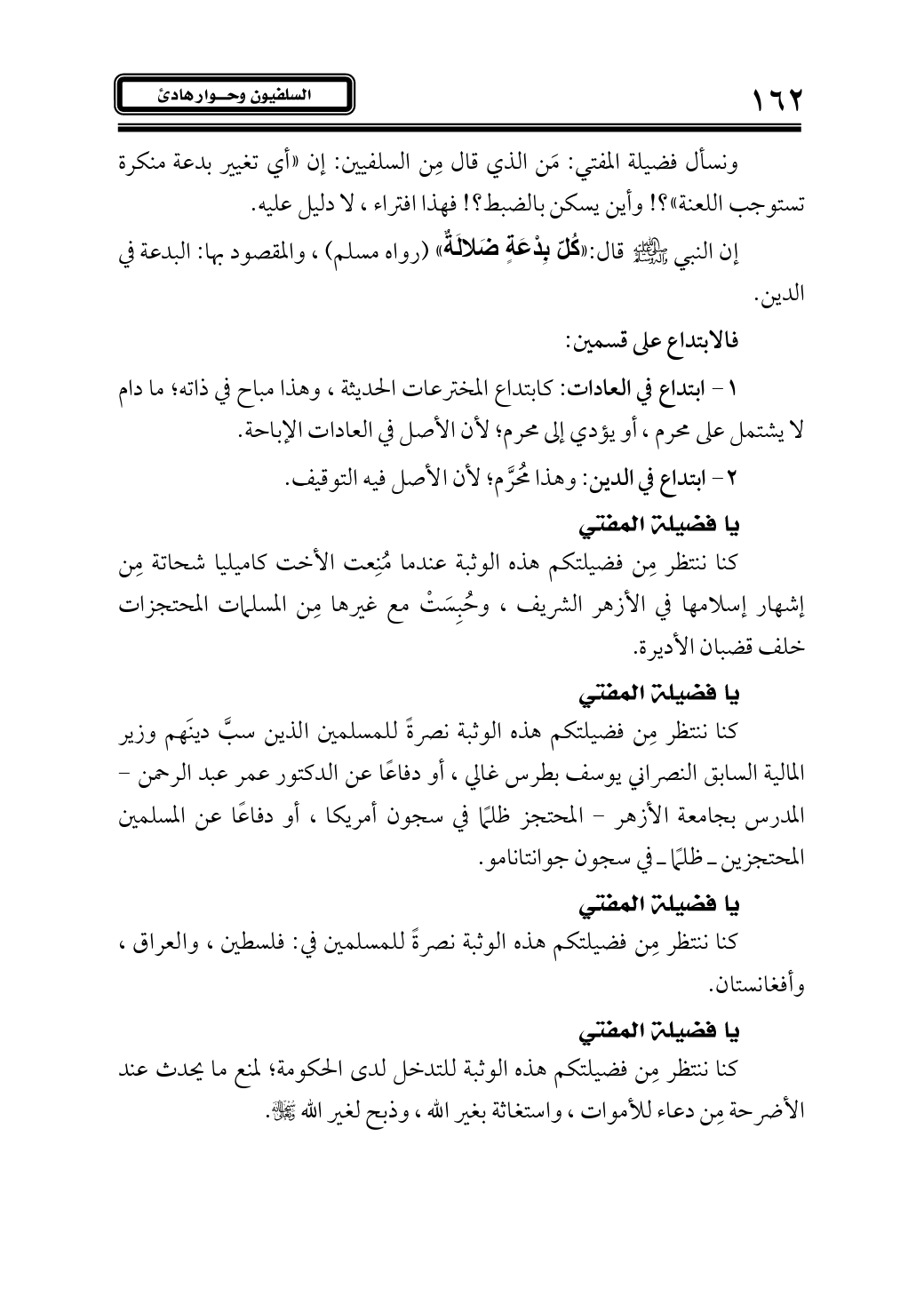 ونسأل فضيلة المفتي: مَن الذي قال مِن السلفيين: إن «أي تغيير بدعة منكرة تستوجب اللعنة»؟! وأين يسكن بالضبط؟! فهذا افتراء، لا دليل عليه.