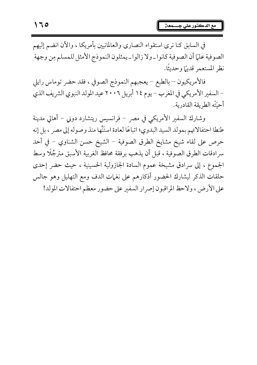 فالأمريكيون - بالطبع - يعجبهم النموذج الصوفي، فقد حضر توماس رايلي - السفير الأمريكي في المغرب - يوم 14 أبريل 2006 عيد المولد النبوي الشريف الذي أحيَتْه الطريقة القادرية.