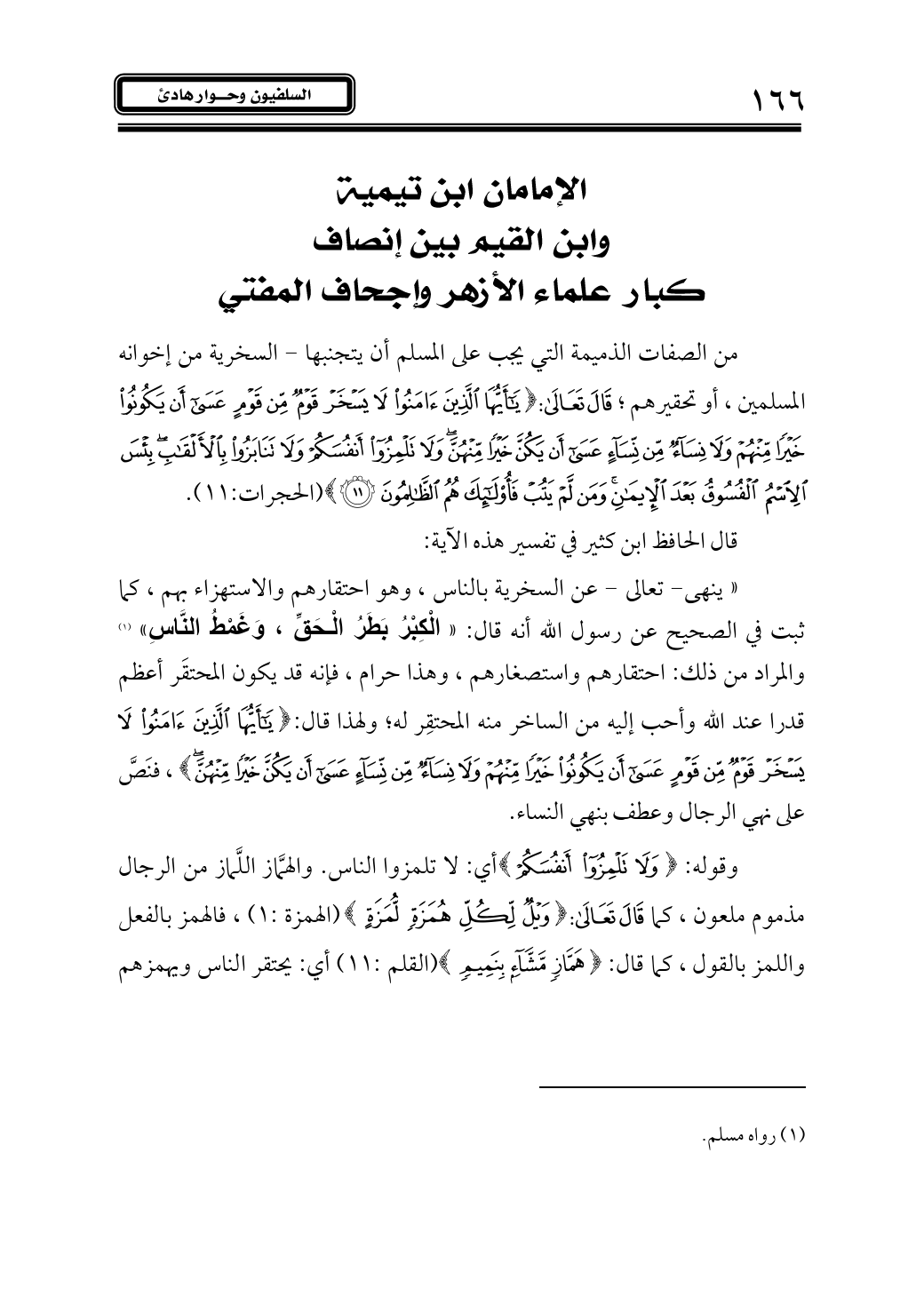 من الصفات الذميمة التي يجب على المسلم أن يتجنبها - السخرية من إخوانه المسلمين، أو تحقيرهم؛ قال تعالى: {يَاأَيُّهَا الَّذِينَ آمَنُوا لَا يَسْخَرْ قَوْمٌ مِنْ قَوْمٍ عَسَى أَنْ يَكُونُوا خَيْرًا مِنْهُمْ وَلَا نِسَاءٌ مِنْ نِسَاءٍ عَسَى أَنْ يَكُنَّ خَيْرًا مِنْهُنَّ وَلَا تَلْمِزُوا أَنْفُسَكُمْ وَلَا تَنَابَزُوا بِالْأَلْقَابِ بِئْسَ الِاسْمُ الْفُسُوقُ بَعْدَ الْإِيمَانِ وَمَنْ لَمْ يَتُبْ فَأُولَئِكَ هُمُ الظَّالِمُونَ (11)} (الحجرات:11).