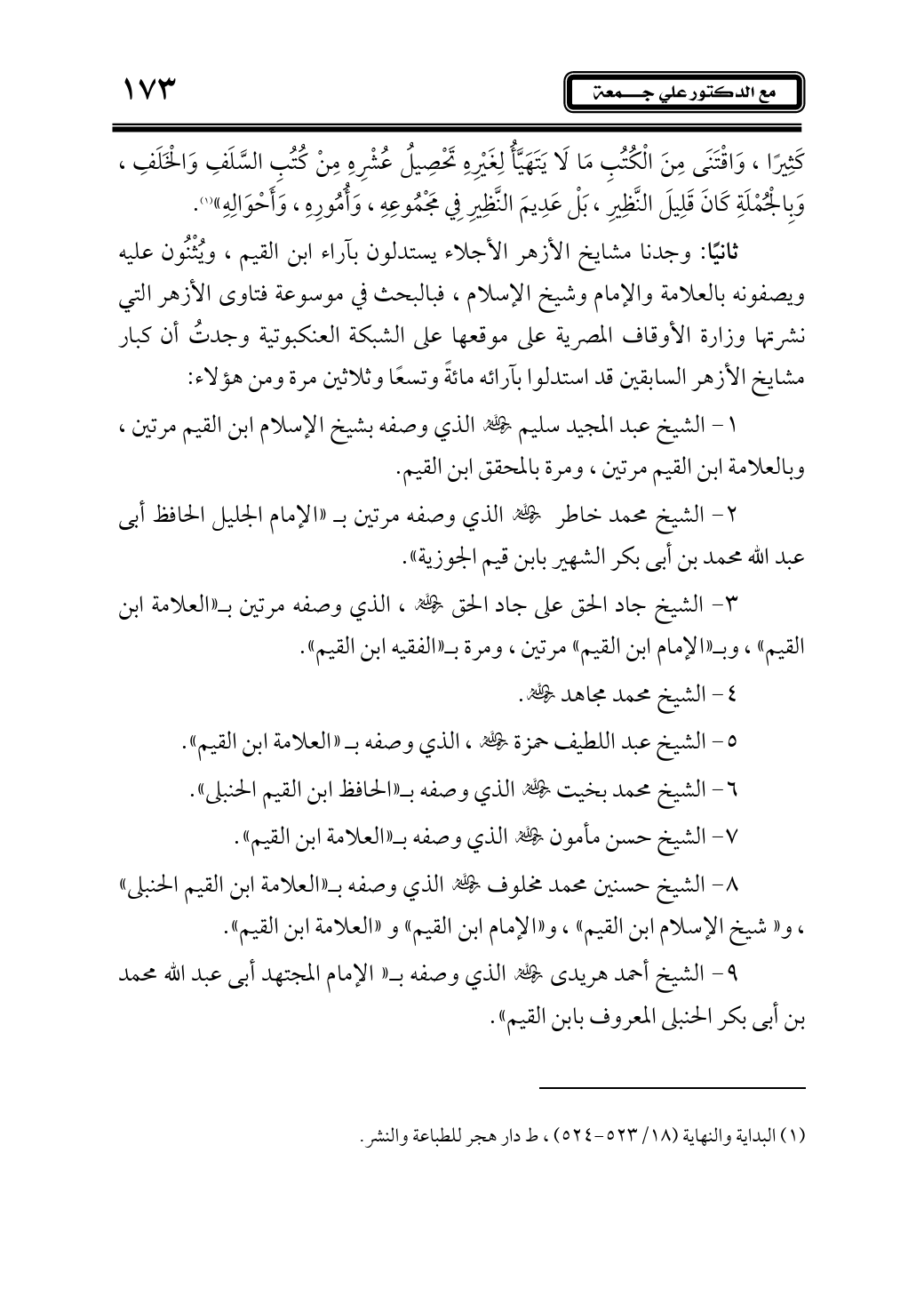 3 - الشيخ جاد الحق على جاد الحق - رحمه الله -، الذي وصفه مرتين بـ «العلامة ابن القيم»، وبـ «الإمام ابن القيم» مرتين، ومرة بـ «الفقيه ابن القيم».