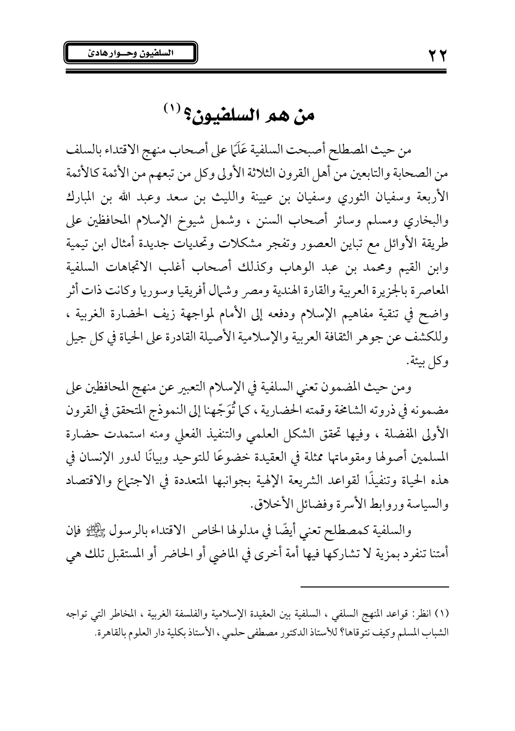 (¬1) انظر: قواعد المنهج السلفي، السلفية بين العقيدة الإسلامية والفلسفة الغربية، المخاطر التي تواجه الشباب المسلم وكيف نتوقاها؟ للأستاذ الدكتور مصطفى حلمي، الأستاذ بكلية دار العلوم بالقاهرة.