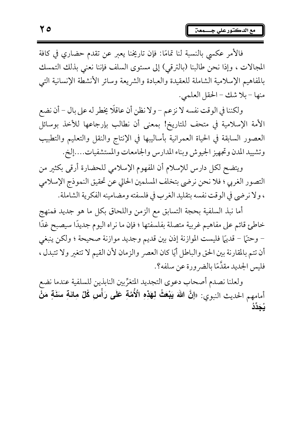 ولعلنا نصدم أصحاب دعوى التجديد المتغرِّبين النابذين للسلفية عندما نضع أمامهم الحديث النبوي: «إِنَّ اللهَ يَبْعَثُ لِهَذِهِ الْأُمَّةِ عَلَى رَأْسِ كُلِّ مِائَةِ سَنَةٍ مَنْ يُجَدِّدُ