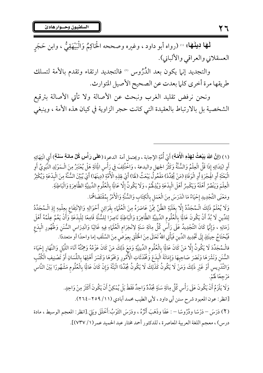 والتجديد إنما يكون بعد الدُرُوس (¬2) فالتجديد ارتقاء وتقدم بالأمة لتسلك طريقها مرة أخرى كلما بعدت عن الصحيح الأصيل المتوارث.