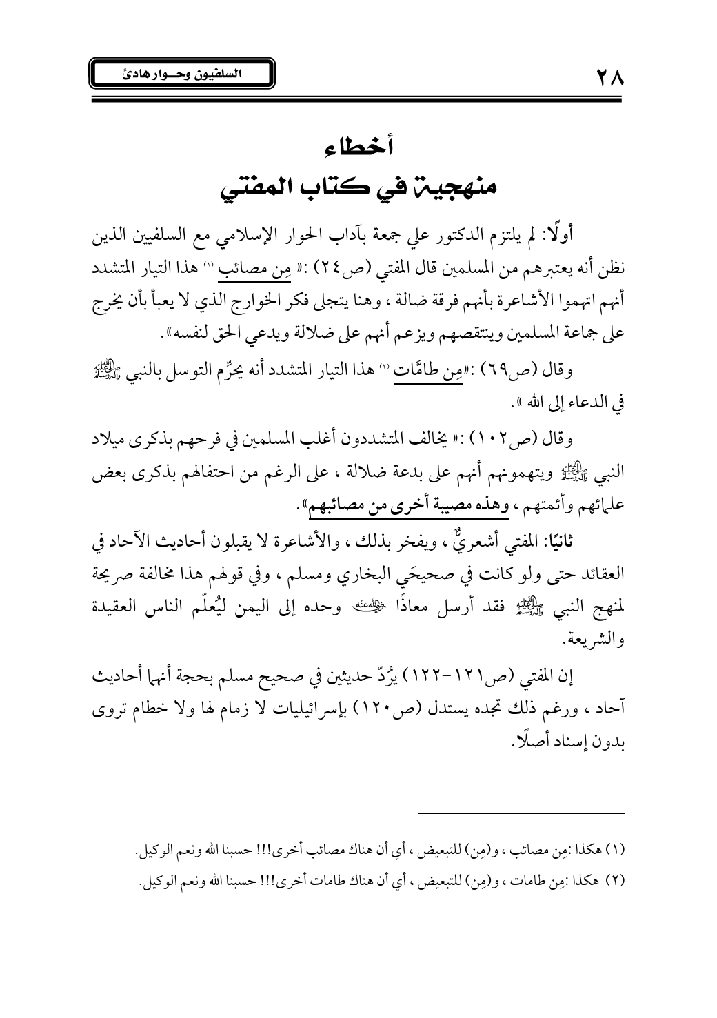 أولًا: لم يلتزم الدكتور علي جمعة بآداب الحوار الإسلامي مع السلفيين الذين نظن أنه يعتبرهم من المسلمين قال المفتي (ص24): «مِن مصائب (¬1) هذا التيار المتشدد أنهم اتهموا الأشاعرة بأنهم فرقة ضالة، وهنا يتجلى فكر الخوارج الذي لا يعبأ بأن يخرج على جماعة المسلمين وينتقصهم ويزعم أنهم على ضلالة ويدعي الحق لنفسه».