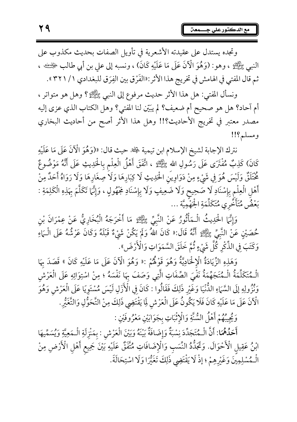 وتجده يستدل على عقيدته الأشعرية في تأويل الصفات بحديث مكذوب على النبي - صلى الله عليه وآله وسلم -، وهو: (وَهُوَ الْآنَ عَلَى مَا عَلَيْهِ كَانَ)، ونسبه إلى علي بن أبي طالب - رضي الله عنه -، ثم قال المفتي في الهامش في تخريج هذا الأثر: «الفَرْق بين الفِرَق للبغدادي 1/ 321».