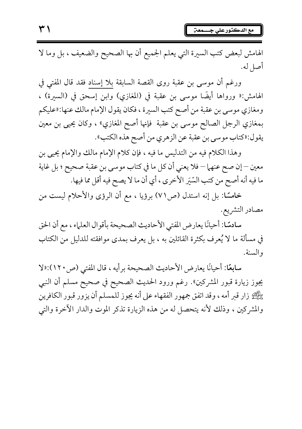 سابعًا: أحيانًا يعارض الأحاديث الصحيحة برأيه، قال المفتي (ص120): «لا يجوز زيارة قبور المشركين». رغم ورود الحديث الصحيح في صحيح مسلم أن النبي - صلى الله عليه وآله وسلم - زار قبر أمه، وقد اتفق جمهور الفقهاء على أنه يجوز للمسلم أن يزور قبور الكافرين والمشركين، وذلك لأنه يتحصل له من هذه الزيارة تذكر الموت والدار الآخرة والتي