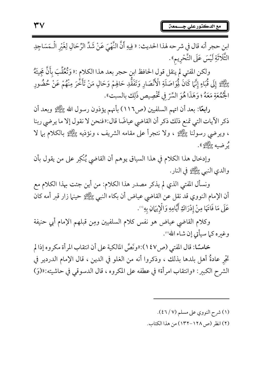 رابعًا: بعد أن اتهم السلفيين (ص116) بأنهم يؤذون رسول الله - صلى الله عليه وآله وسلم - وبعد أن ذكر الآيات التي تمنع ذلك ذكر أن القاضي عياضًا قال: «فنحن لا نقول إلا ما يرضي ربنا، ويرضي رسولنا - صلى الله عليه وآله وسلم -، ولا نتجرأ على مقامه الشريف، ونؤذيه - صلى الله عليه وآله وسلم - بالكلام بما لا يُرضيه - صلى الله عليه وآله وسلم -».
