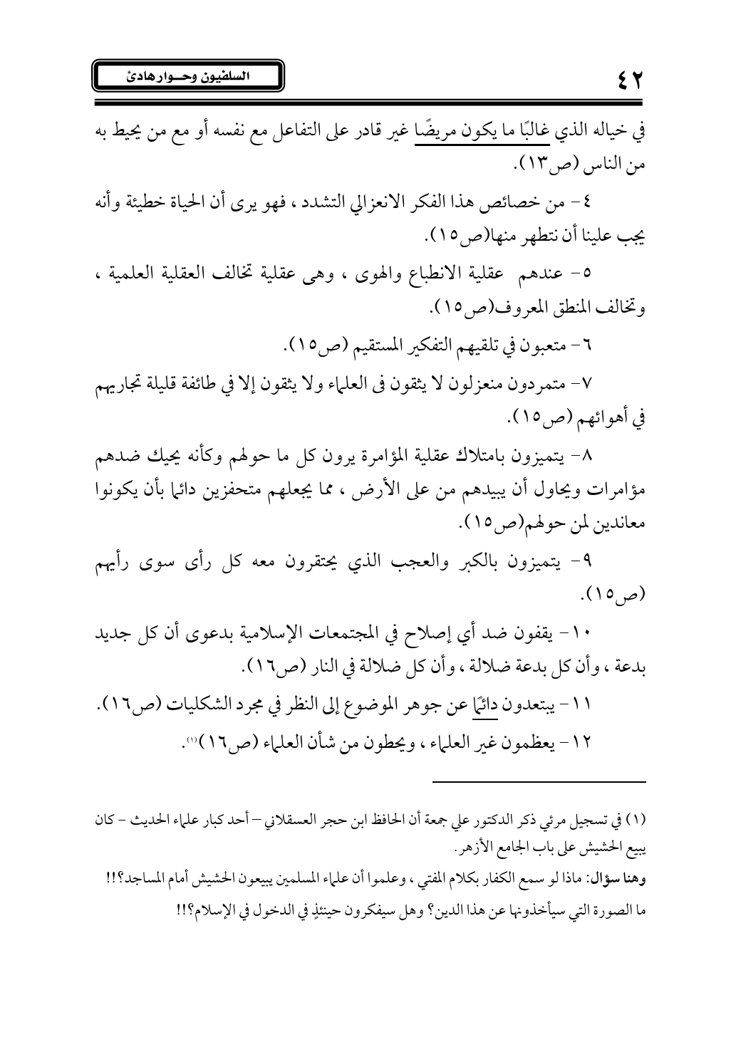 7 - متمردون منعزلون لا يثقون فى العلماء ولا يثقون إلا في طائفة قليلة تجارىهم في أهوائهم (ص15).