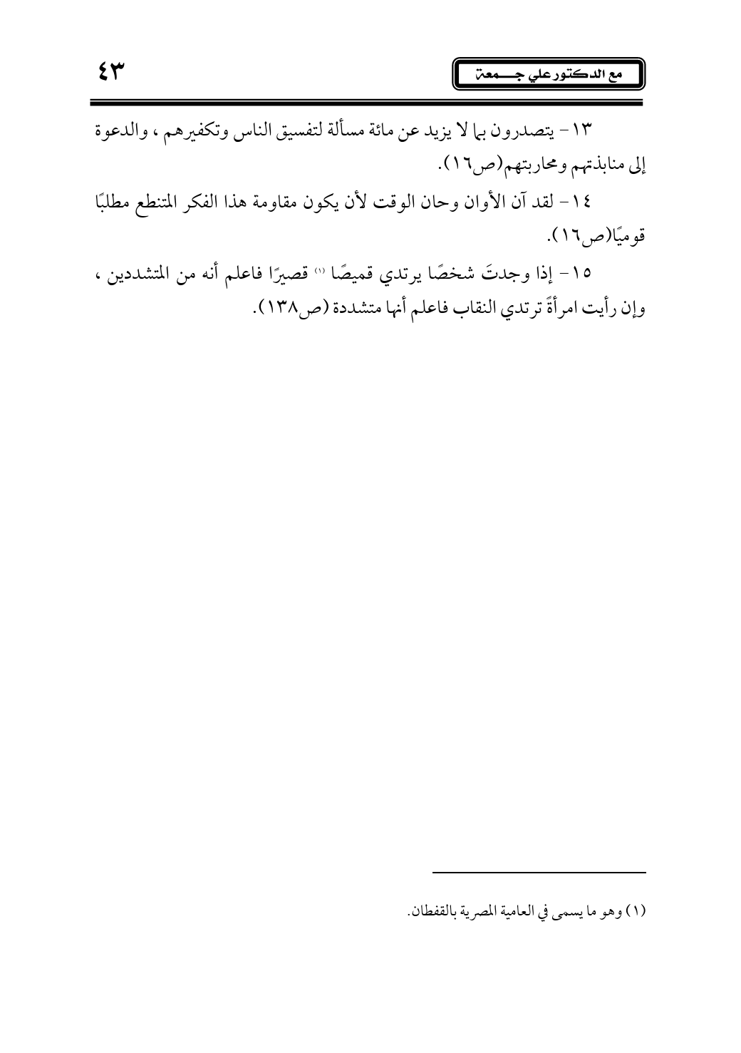 14 - لقد آن الأوان وحان الوقت لأن يكون مقاومة هذا الفكر المتنطع مطلبًا قوميًا (ص16).