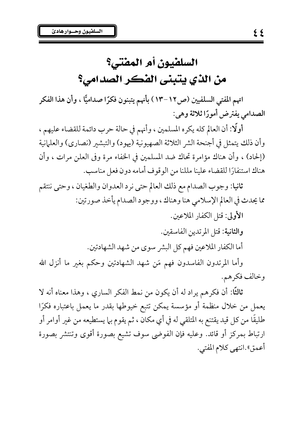 اتهم المفتي السلفيين (ص12 - 13) بأنهم يتبنون فكرًا صداميًّا، وأن هذا الفكر الصدامي يفترض أمورًا ثلاثة وهى: