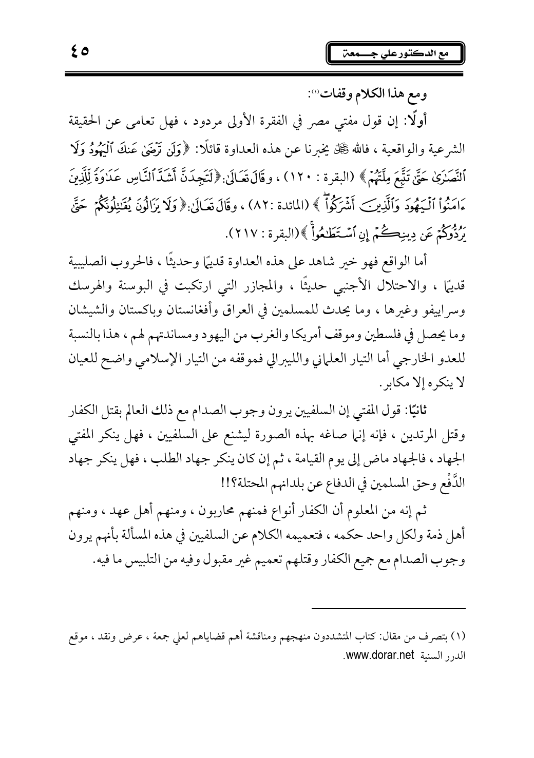 ثانيًا: قول المفتي إن السلفيين يرون وجوب الصدام مع ذلك العالم بقتل الكفار وقتل المرتدين، فإنه إنما صاغه بهذه الصورة ليشنع على السلفيين، فهل ينكر المفتي الجهاد، فالجهاد ماض إلى يوم القيامة، ثم إن كان ينكر جهاد الطلب، فهل ينكر جهاد الدَّفْع وحق المسلمين في الدفاع عن بلدانهم المحتلة؟!!