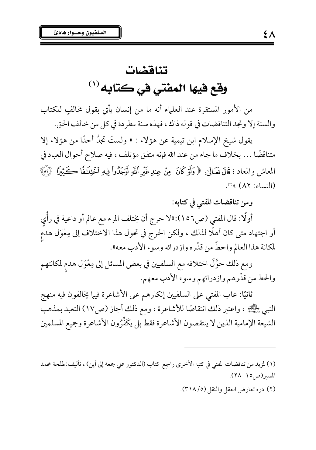 (¬1) لمزيد من تناقضات المفتي في كتبه الأخرى راجع كتاب (الدكتور علي جمعة إلى أين)، تأليف: طلحة محمد المسير (ص15 - 28).