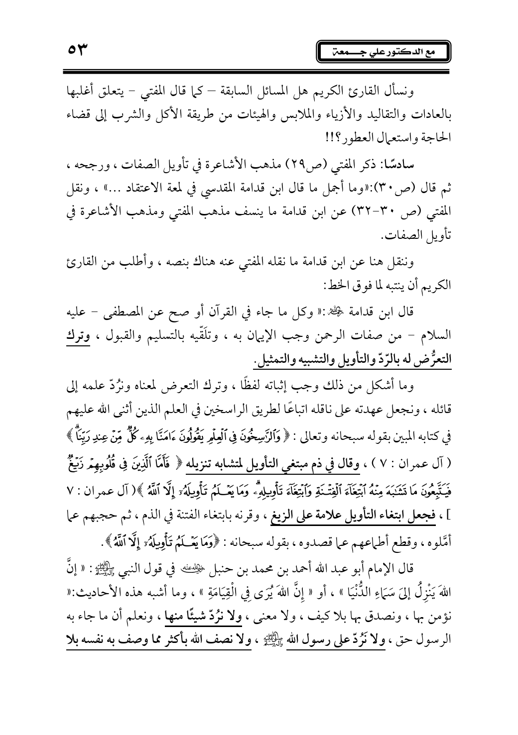 سادسًا: ذكر المفتي (ص29) مذهب الأشاعرة في تأويل الصفات، ورجحه، ثم قال (ص30): «وما أجمل ما قال ابن قدامة المقدسي في لمعة الاعتقاد ... »، ونقل المفتي (ص 30 - 32) عن ابن قدامة ما ينسف مذهب المفتي ومذهب الأشاعرة في تأويل الصفات.