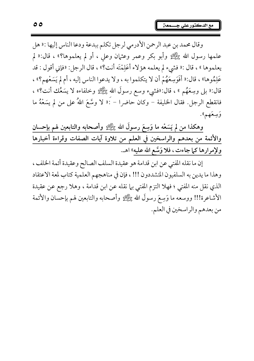 إن ما نقله المفتي عن ابن قدامة هو عقيدة السلف الصالح وعقيدة أئمة الخلف، وهذا ما يدين به السلفيون المتشددون!!!، فإن في مناهجهم العلمية كتاب لمعة الاعتقاد الذي نقل منه المفتي؛ فهَلّا التزم المفتي بما نقله عن ابن قدامة، وهَلّا رجع عن عقيدة الأشاعرة!!! ووسعه ما وَسِعَ رسولَ الله - صلى الله عليه وآله وسلم - وأصحابه والتابعين لهم بإحسان والأئمة من بعدهم والراسخين في العلم.