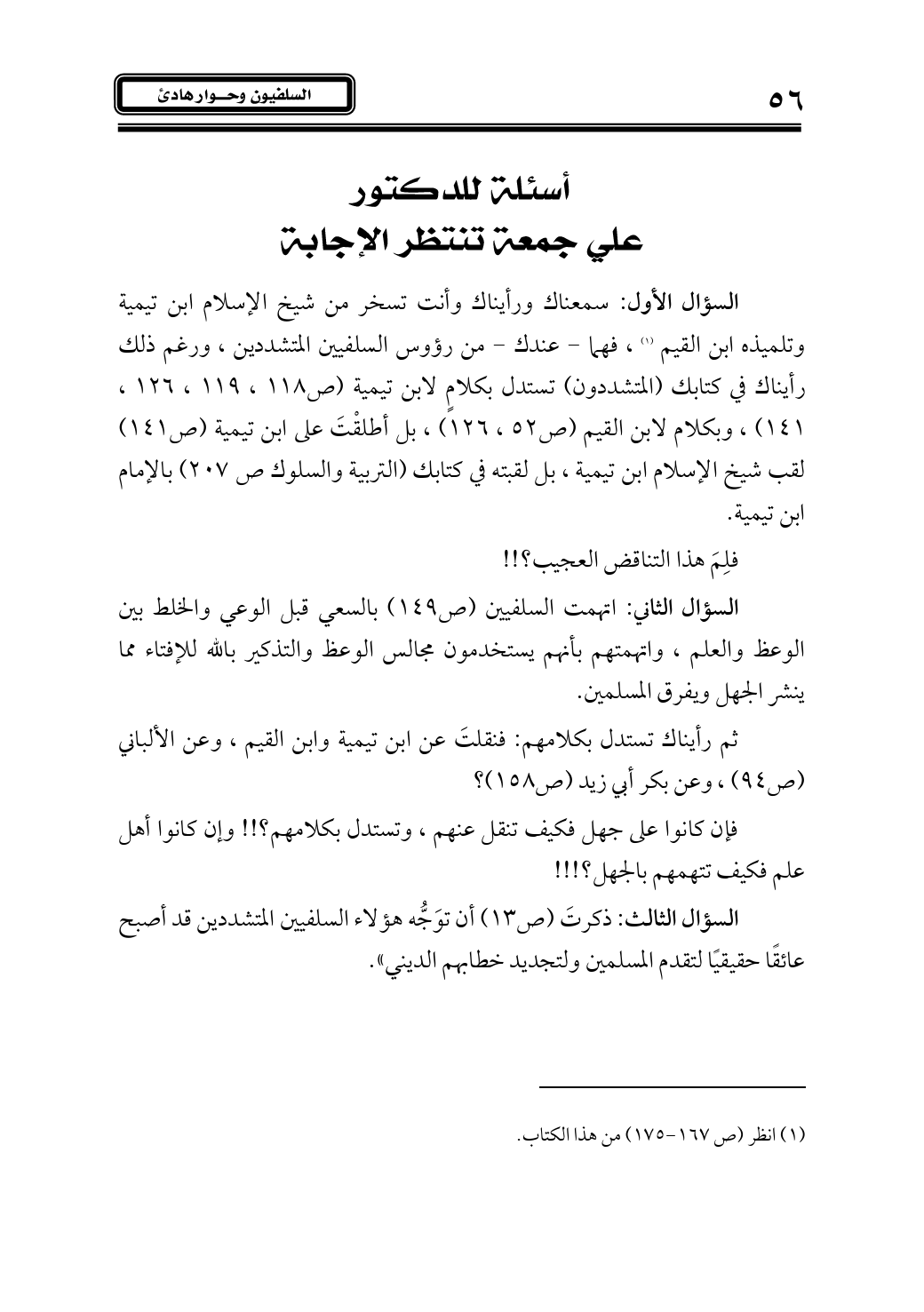 السؤال الأول: سمعناك ورأيناك وأنت تسخر من شيخ الإسلام ابن تيمية وتلميذه ابن القيم (¬1)، فَهُما - عندك - من رؤوس السلفيين المتشددين، ورغم ذلك رأيناك في كتابك (المتشددون) تستدل بكلامٍ لابن تيمية (ص118، 119، 126، 141)، وبكلام لابن القيم (ص52، 126)، بل أطلقْتَ على ابن تيمية (ص141) لقب شيخ الإسلام ابن تيمية، بل لقبته في كتابك (التربية والسلوك ص 207) بالإمام ابن تيمية.