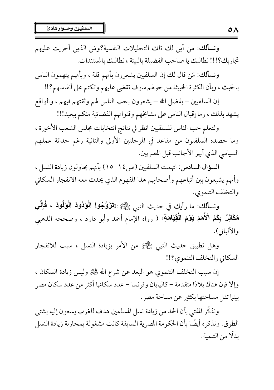 السؤال السادس: اتهمت السلفيين (ص14 - 15) بأنهم يحاولون زيادة النسل، وأنهم يشيعون بين أتباعهم وأصحابهم هذا المفهوم الذي يحدث معه الانفجار السكاني والتخلف التنموي.
