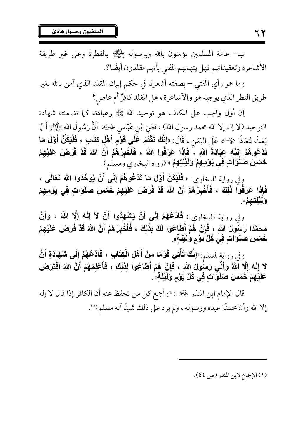 ب- عامة المسلمين يؤمنون بالله وبرسوله - صلى الله عليه وآله وسلم - بالفطرة وعلى غير طريقة الأشاعرة وتعقيداتهم فهل يتهمهم المفتي بأنهم مقلدون أيضًا؟.