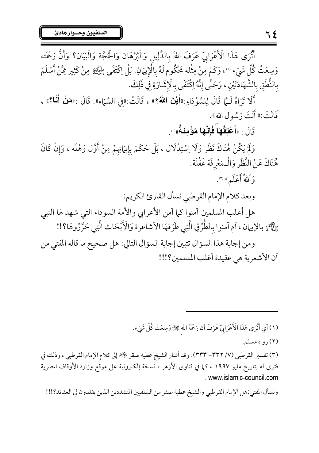 وبعد كلام الإمام القرطبي نسأل القارئ الكريم: هل أغلب المسلمين آمنوا كما آمن الأعرابي والأمة السوداء التي شهد لها النبي - صلى الله عليه وآله وسلم - بالإيمان، أم آمنوا بِالطُّرُقِ الَّتِي طَرَقهَا الأشاعرة وَالْأَبْحَاث الَّتِي حَرَّرُوهَا؟!!