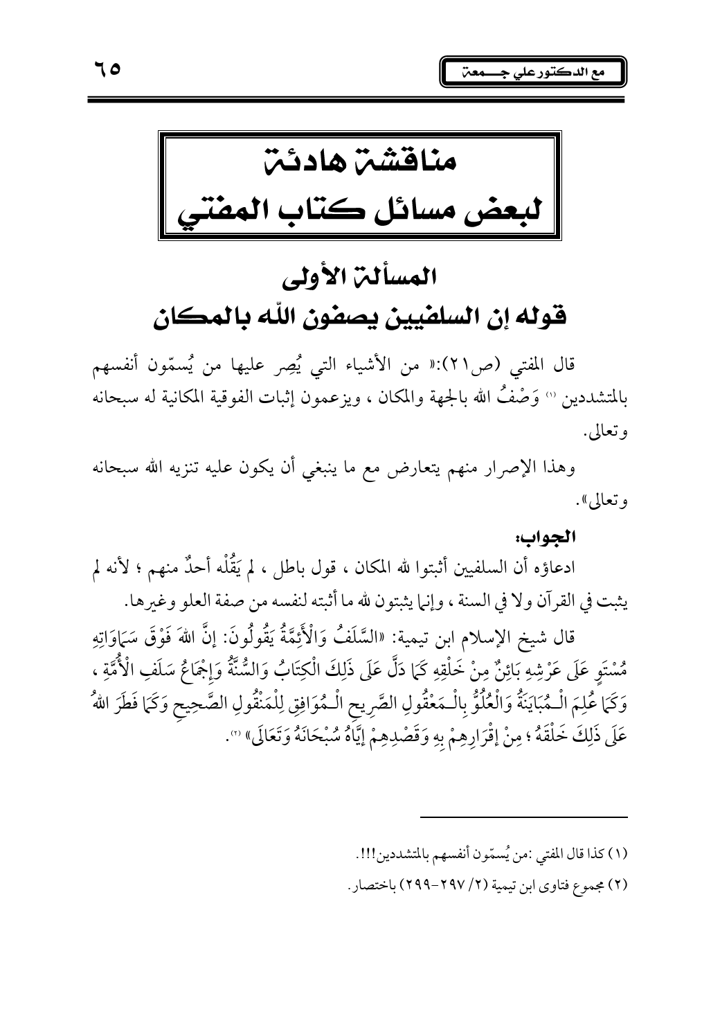 قال المفتي (ص21): «من الأشياء التي يُصِر عليها من يُسمّون أنفسهم بالمتشددين (¬1) وَصْفُ الله بالجهة والمكان، ويزعمون إثبات الفوقية المكانية له سبحانه وتعالى.