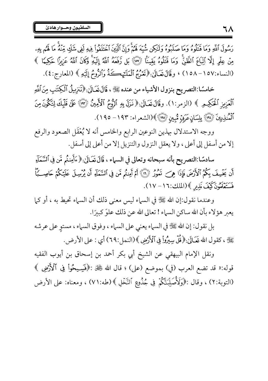 ووجه الاستدلال بهذين النوعين الرابع والخامس أنه لا يُعْقَل الصعود والرفع إلا من أسفل إلى أعلى، ولا يعقل النزول والتنزيل إلا من أعلى إلى أسفل.