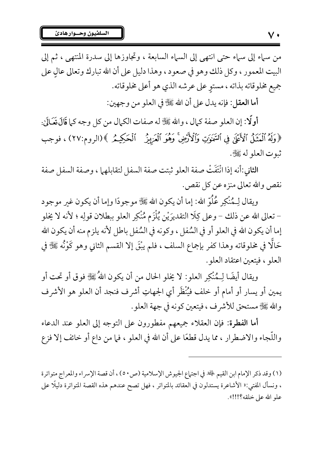 أولًا: إن العلو صفة كمال، والله - سبحانه وتعالى - له صفات الكمال من كل وجه كما قال تعالى: {وَلَهُ الْمَثَلُ الْأَعْلَى فِي السَّمَاوَاتِ وَالْأَرْضِ وَهُوَ الْعَزِيزُ الْحَكِيمُ} (الروم:27)، فوجب ثبوت العلو له - سبحانه وتعالى -.