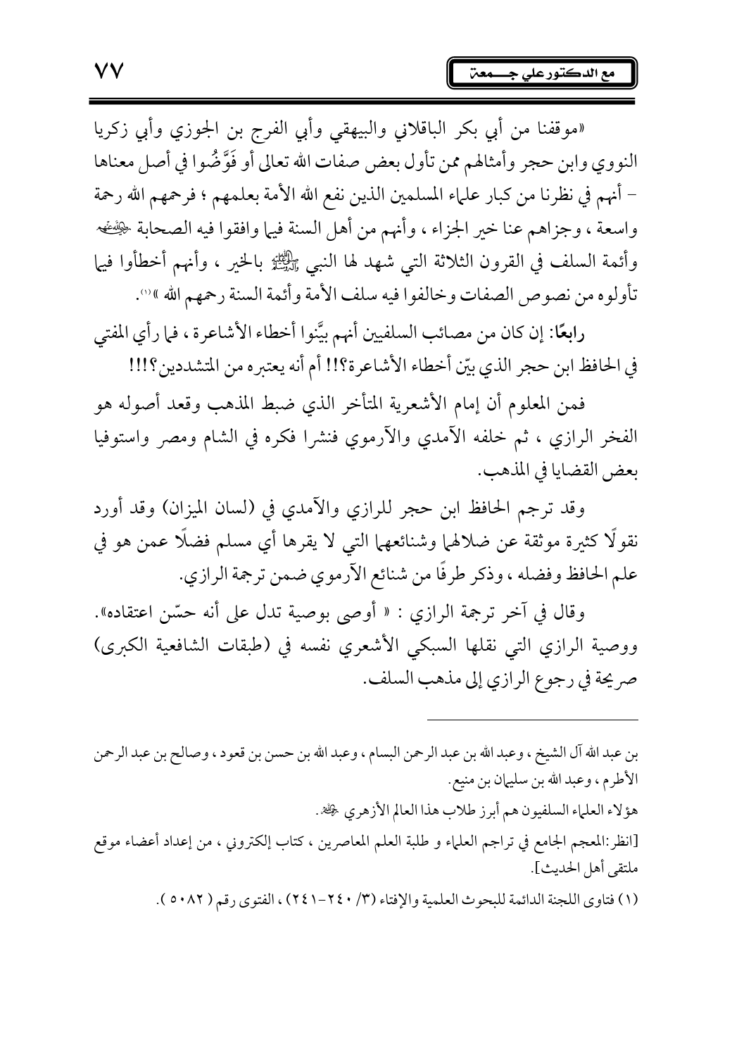 «موقفنا من أبي بكر الباقلاني والبيهقي وأبي الفرج بن الجوزي وأبي زكريا النووي وابن حجر وأمثالهم ممن تأول بعض صفات الله تعالى أو فَوَّضُوا في أصل معناها - أنهم في نظرنا من كبار علماء المسلمين الذين نفع الله الأمة بعلمهم؛ فرحمهم الله رحمة واسعة، وجزاهم عنا خير الجزاء، وأنهم من أهل السنة فيما وافقوا فيه الصحابة - رضي الله عنهم - وأئمة السلف في القرون الثلاثة التي شهد لها النبي - صلى الله عليه وآله وسلم - بالخير، وأنهم أخطأوا فيما تأولوه من نصوص الصفات وخالفوا فيه سلف الأمة وأئمة السنة رحمهم الله» (¬1).
