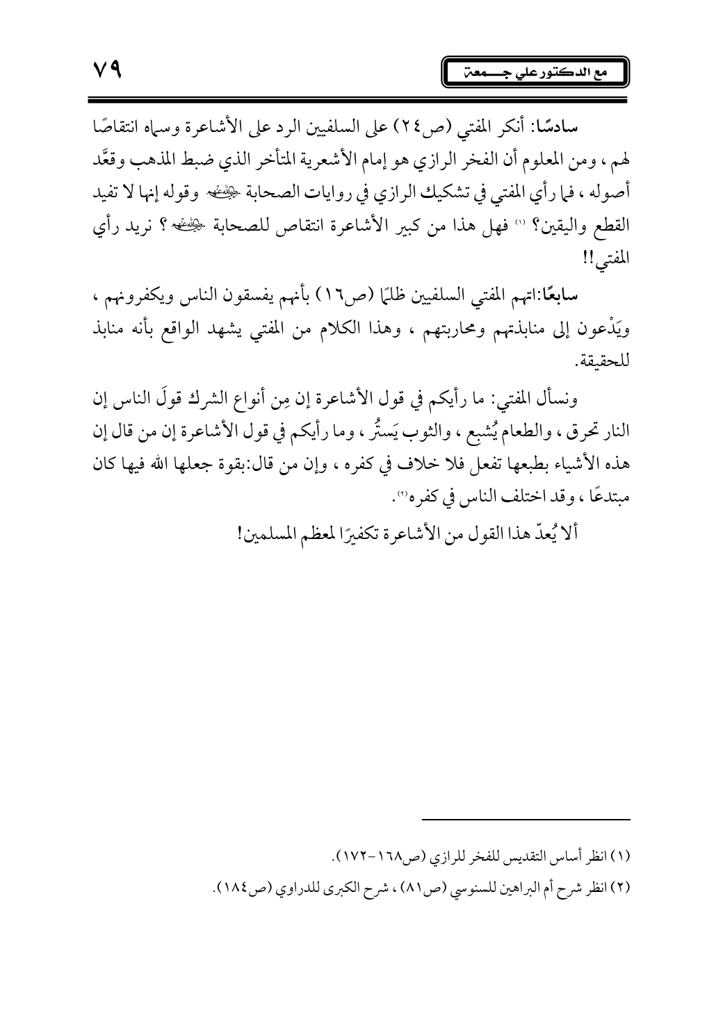 سادسًا: أنكر المفتي (ص24) على السلفيين الرد على الأشاعرة وسماه انتقاصًا لهم، ومن المعلوم أن الفخر الرازي هو إمام الأشعرية المتأخر الذي ضبط المذهب وقعَّد أصوله، فما رأي المفتي في تشكيك الرازي في روايات الصحابة - رضي الله عنهم - وقوله إنها لا تفيد القطع واليقين؟ (¬1) فهل هذا من كبير الأشاعرة انتقاص للصحابة - رضي الله عنهم -؟ نريد رأي المفتي!!
