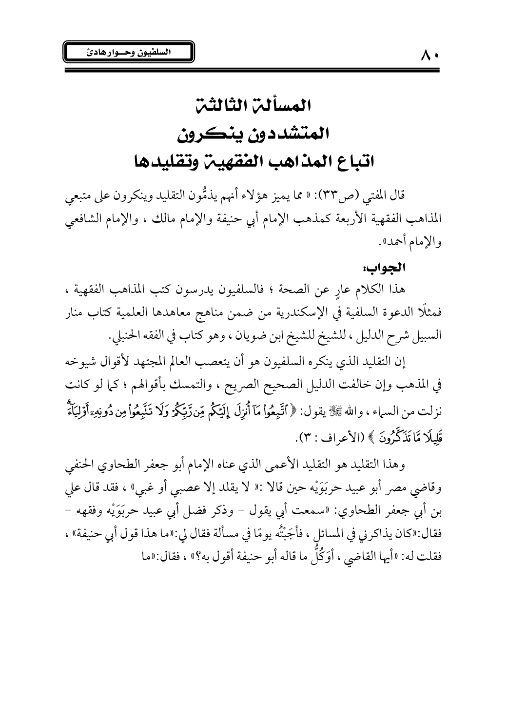 قال المفتي (ص33): «مما يميز هؤلاء أنهم يذمُّون التقليد وينكرون على متبعي المذاهب الفقهية الأربعة كمذهب الإمام أبي حنيفة والإمام مالك، والإمام الشافعي والإمام أحمد».