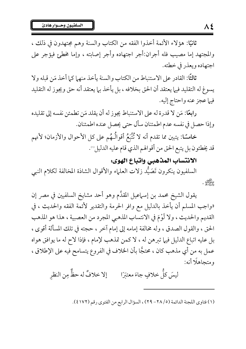 السلفيون ينكرون تَصَيُّد زلات العلماء والأقوال الشاذة المخالفة لكلام النبي - صلى الله عليه وآله وسلم -. يقول الشيخ محمد بن إسماعيل المقدَّم وهو أحد مشايخ السلفيىن في مصر إن «واجب المسلم أن يأخذ بالدليل مع وافر الحرمة والتقدير لأئمة الفقه والحديث، في القديم والحديث، ولا لَوْمَ في الانتساب المذهبي المجرد من العصبية، هذا هو المذهب الحق، والقول الصدق، وله مخالفة إمامه إلى إمام آخر، حجته في تلك المسألة أقوى، بل عليه اتباع الدليل فيما تبرهن له، لا كمن تمذهب لإمام، فإذا لاح له ما يوافق هواه عمل به من أي مذهب كان، محتجًّا بأن الخلاف في الفروع يتسامح فيه على الإطلاق، ومتجاهلًا أنه: