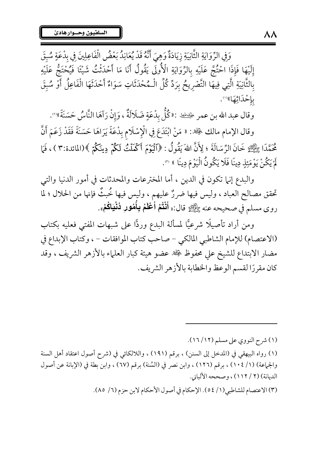ومن أراد تأصيلًا شرعيًّا لمسألة البدع وردًّا على شبهات المفتي فعليه بكتاب (الاعتصام) للإمام الشاطبي المالكي - صاحب كتاب الموافقات -، وكتاب الإبداع في مضار الابتداع للشيخ علي محفوظ - رحمه الله - عضو هيئة كبار العلماء بالأزهر الشريف، وقد كان مقررًا لقسم الوعظ والخطابة بالأزهر الشريف.