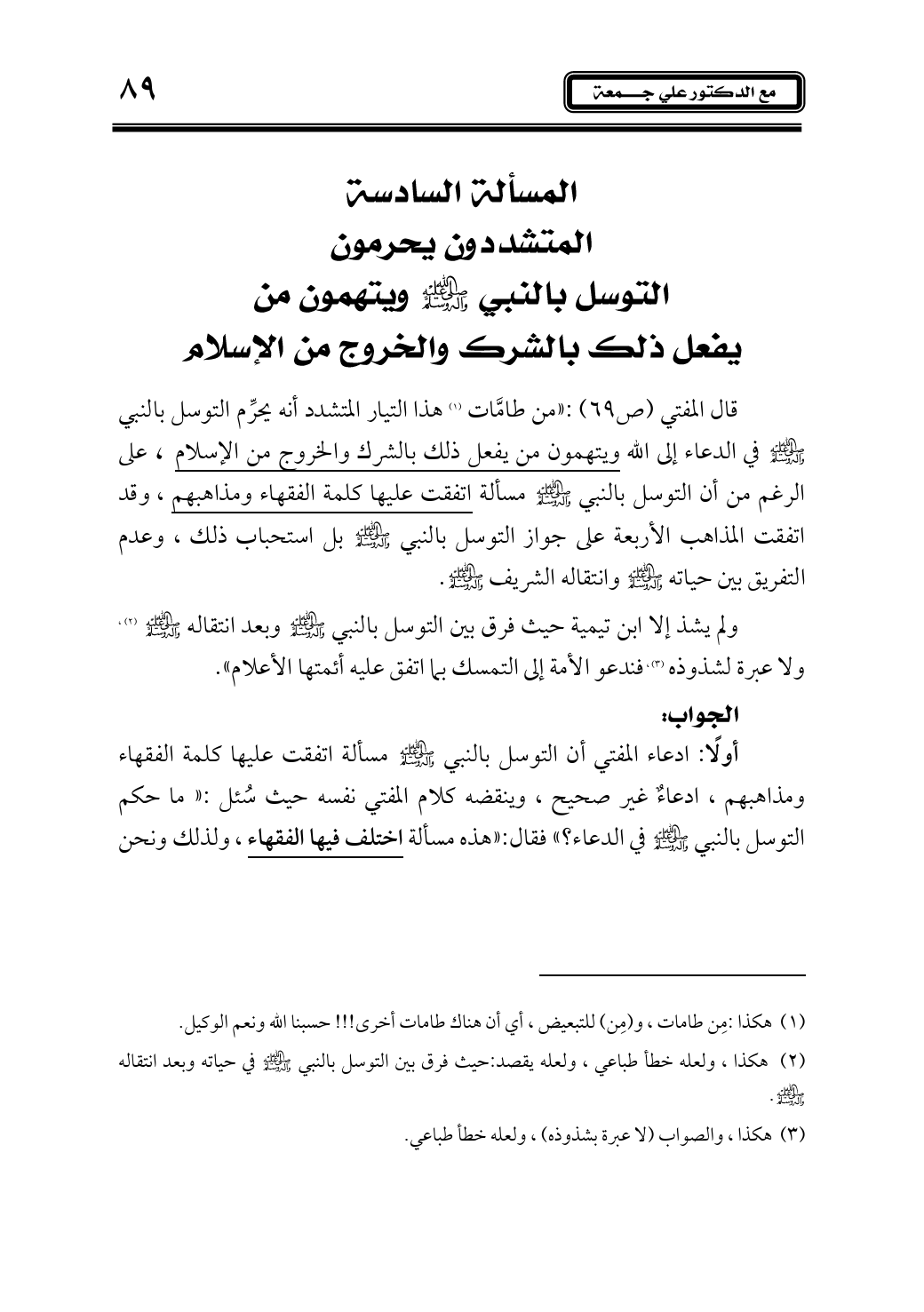 (¬2) هكذا، ولعله خطأ طباعي، ولعله يقصد: حيث فرّق بين التوسل بالنبي - صلى الله عليه وآله وسلم - في حياته وبعد انتقاله - صلى الله عليه وآله وسلم -.