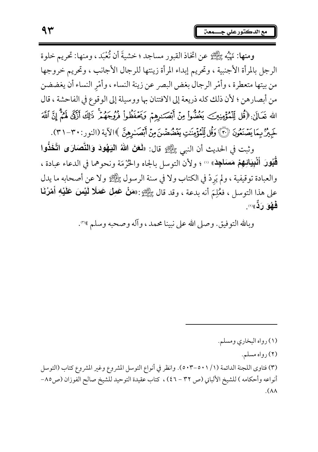 وثبت في الحديث أن النبي - صلى الله عليه وآله وسلم - قال: «لَعَنَ اللهُ اليَهُودَ وَالنَّصَارَى اتَّخَذُوا قُبُورَ أَنْبِيَائِهِمْ مَسَاجِدَ» (¬1)؛ ولأن التوسل بالجاه والحُرْمَة ونحوهما في الدعاء عبادة، والعبادة توقيفية، ولم يَرِدْ في الكتاب ولا في سنة الرسول - صلى الله عليه وآله وسلم - ولا عن أصحابه ما يدل على هذا التوسل، فعُلِمَ أنه بدعة، وقد قال - صلى الله عليه وآله وسلم -: «مَنْ عَمِلَ عَمَلًا لَيْسَ عَلَيْهِ أَمْرُنَا فَهُوَ رَدٌّ» (¬2).